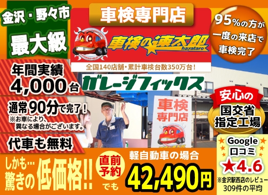 ガレージフィックス運営の車検専門店「車検の速太郎」金沢駅西店,野々市店