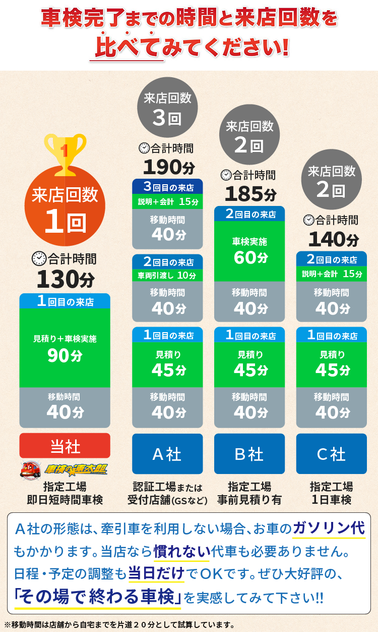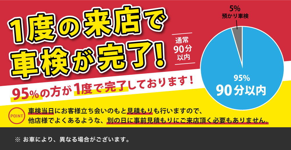 当店では最短即日(通常90分)で車検が完了します。お買い物ついでに、お仕事の帰りに是非弊社車検工場へお立ち寄りくださいませ。