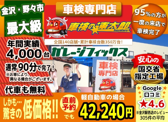 ガレージフィックス運営の車検専門店「車検の速太郎」金沢駅西店,野々市店